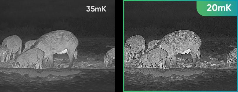 Die hohe thermische Empfindlichkeit sorgt für eine perfekte Detailerkennung selbst unter schwierigsten Wetterbedingungen, wenn Objekt und Hintergrund einen minimalen Temperaturunterschied aufweisen. Die kleinsten Details von Objekten und Hintergründen lassen sich leicht und deutlich erkennen, z. B. Tierhaare, körperliche Merkmale von männlichen, weiblichen oder trächtigen Tieren, Zweige, Blätter usw.